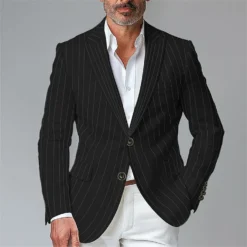 The men magnum business peak lapel two button pinstripe blazer is a perfect blend of sophistication and style. Its peak lapel design adds a touch of contemporary flair, making it suitable for various occasions, from office meetings to formal events.