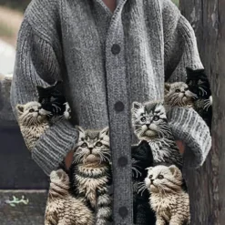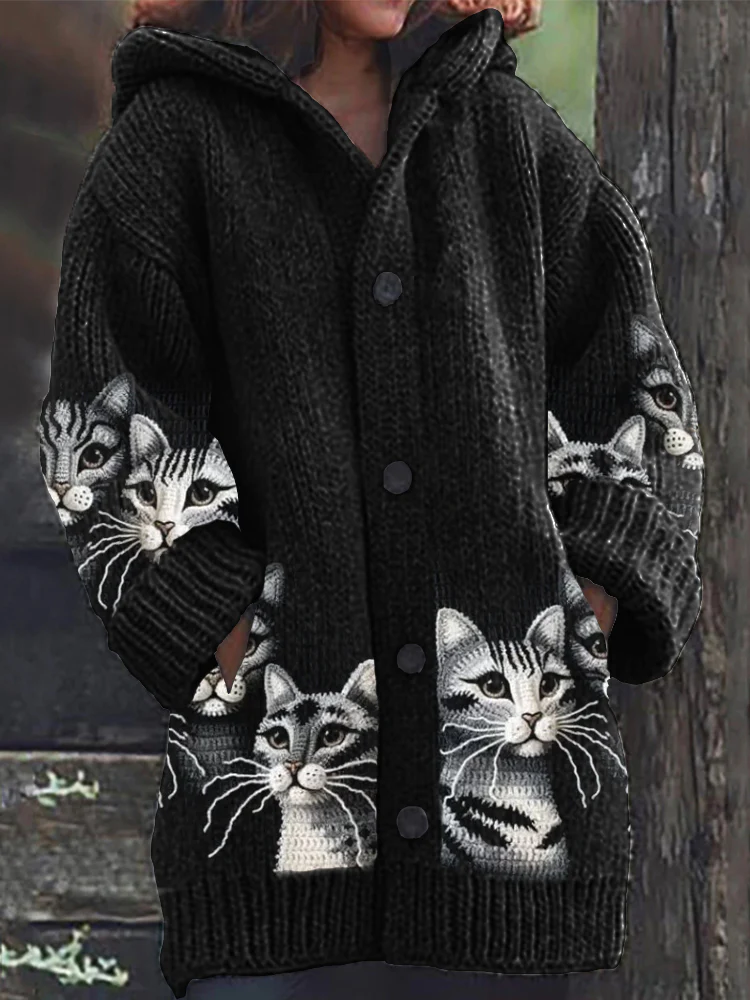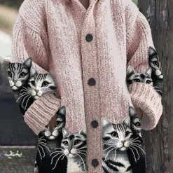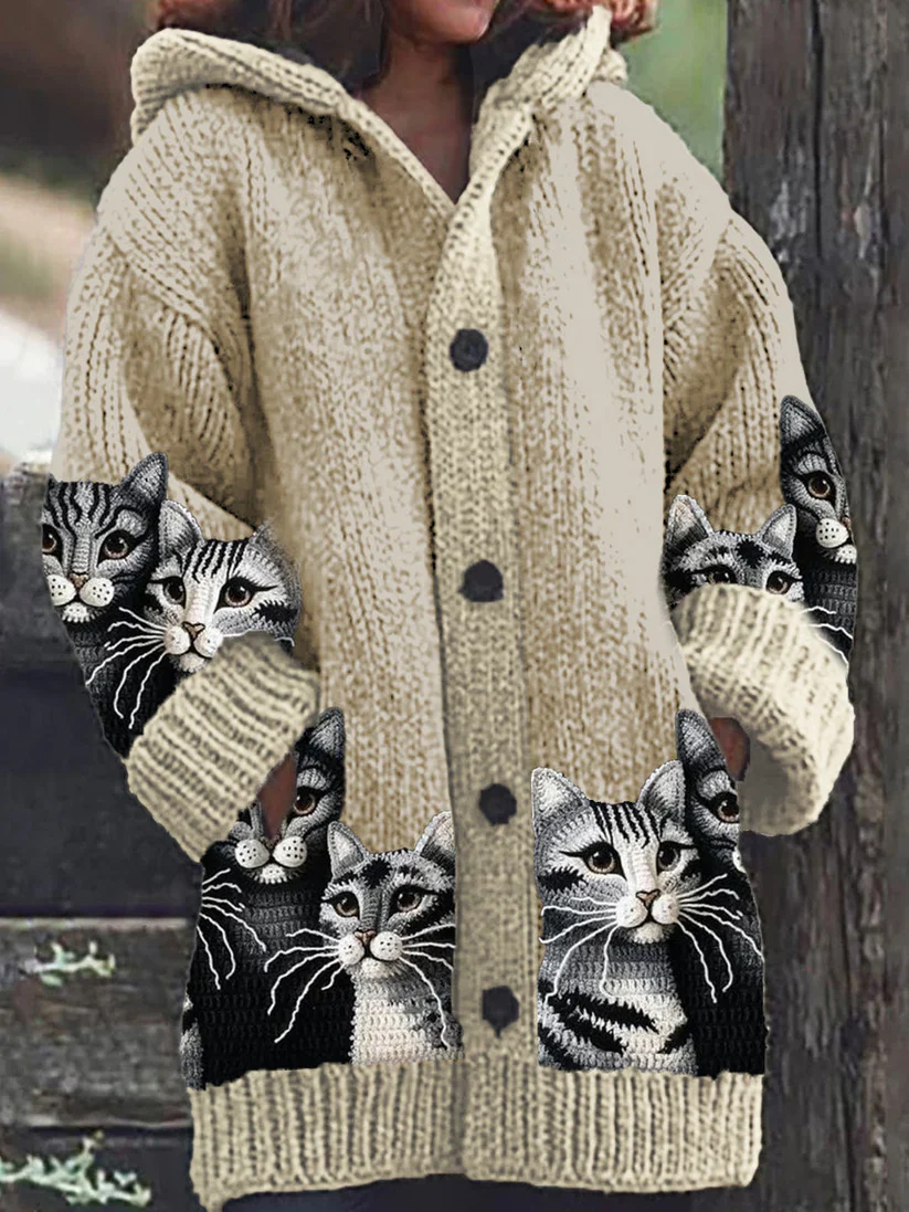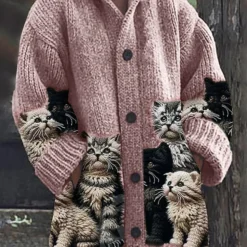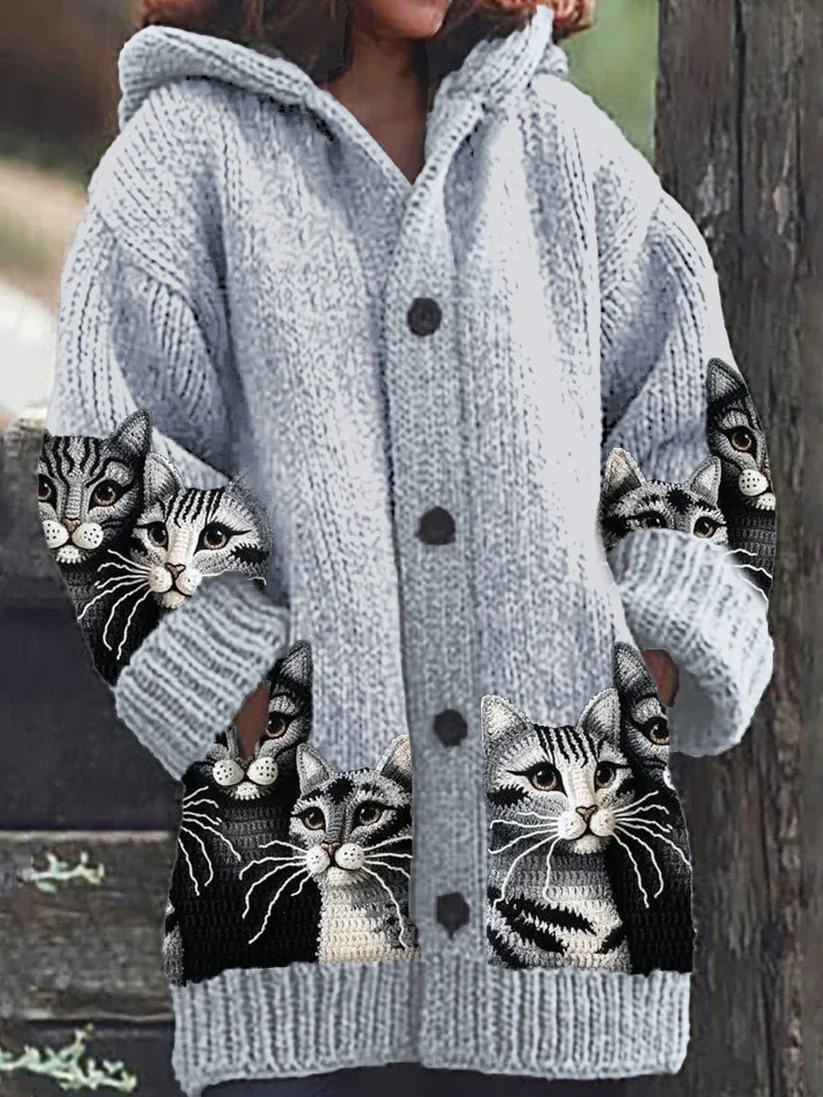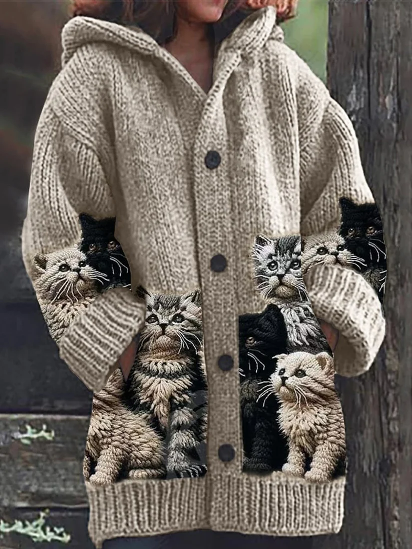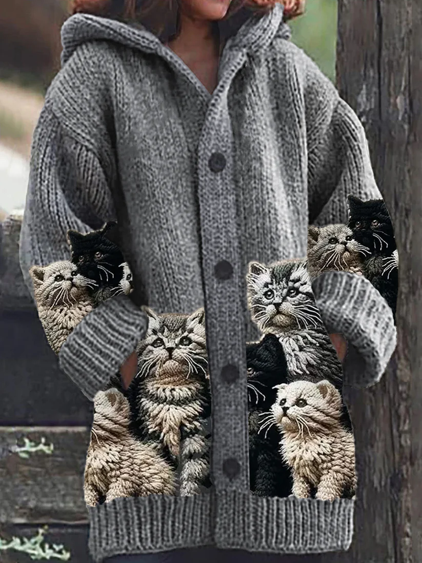 The woman magnum retro cute pet print button up thick long sleeve hooded sweater cardigan is a perfect blend of style and comfort. This cardigan features a whimsical pet print that adds a playful touch to your wardrobe, making it a delightful choice for everyday wear.