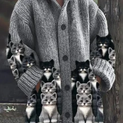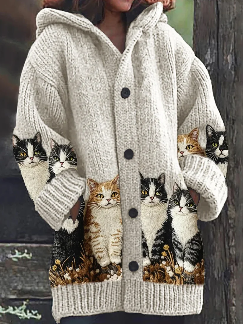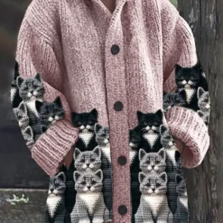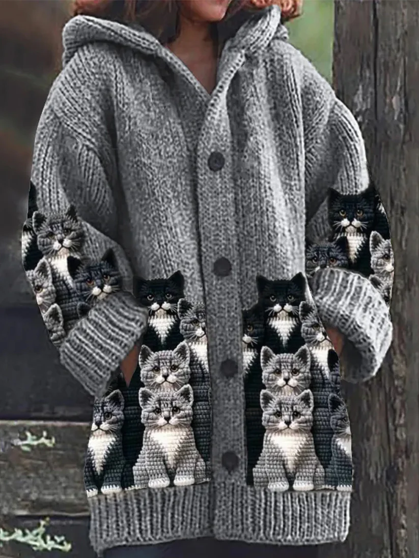 Woman MAGNUM Retro Cute Pet Print Button Up Thick Long Sleeve Hooded Sweater Cardigan
