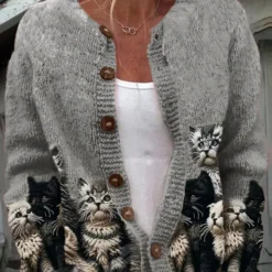 Elevate your wardrobe with the charming woman’s magnum stylish retro cat print button down casual long sleeve knit cardigan sweater. This piece combines playful feline graphics with a cozy design, perfect for adding a touch of fun to your everyday outfit.